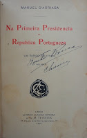 Manuel de Arriaga (1840-1917). "Foi o primeiro Presidente da República de Portugal, eleito em Agosto de 1911. “Filiado no Partido Republicano Português, pertencia ao Directório quando rebentou a revolta de 31 de Janeiro de 1891, mas não foi incomodado pelas autoridades. Nesse mesmo ano candidatou-se a deputado pela Madeira tendo sido eleito. Passados alguns anos voltou a assumir funções parlamentares, distinguindo-se na luta contra as instituições monárquicas e contra a corrupção. Entretanto participou activamente em comícios que se realizavam em Lisboa e os seus discursos inflamados contribuíam para aumentar o número de adeptos à causa republicana. Depois do 5 de Outubro foi deputado às Constituintes e, no dia 24 de Agosto de 1911, tomou posse do cargo de Presidente da República. O seu mandato foi muito agitado e cheio de dificuldades porque os diferentes partidos republicanos que então se formaram não se conseguiam entender. Além disso, instalou-se um clima de grande agitação social tendo havido também tentativas de reposição da monarquia. Greves, tumultos, insegurança levaram a sucessivas quedas do governo. Só entre 1911 e 1914 tomaram posse oito governos. Em Janeiro de 1915, Manuel de Arriaga dissolveu o parlamento e consentiu que se instalasse a ditadura de Pimenta de Castro. As reacções não se fizeram esperar. Os opositores reuniram-se, o Presidente da República foi declarado fora da lei e, logo em Maio, rebentou uma revolução que repôs a ordem democrática e o forçou a demitir-se.” Ao abandonar a Presidência da República, Manuel de Arriaga dedicou-se à escrita; em 1916 publica a presente obra - “Na Primeira Presidência da República Portuguesa : um rápido relatório” - onde procura justificar o seu rumo político até à sua demissão.