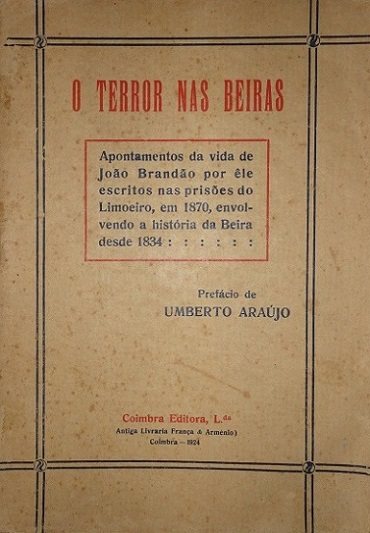 BRANDÃO, João - O TERROR NAS BEIRAS. Apontamentos da vida de João Brandão, por êle escritos nas prisões do Limoeiro, em 1870, envolvendo a história da Beira desde 1834. Prefácio de Umberto Araújo. Coimbra, Coimbra Editora, L.da, 1924. In-8.º (19cm) de [8], 381, [3] p. ; B.