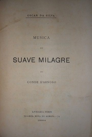 ARNOSO, Conde d' - SUAVE MILAGRE : mysterio em 4 actos e 6 quadros. Extrahido de um conto de Eça de Queiroz com versos de Alberto d'Oliveira e musica de Oscar da Silva. Lisboa, Livraria Ferin, 1902. In-4.º
