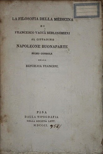 BERLINGHIERI, Francesco Vaccà - LA FILOSOFIA DELLA MEDICINA. Di... al cittadino Napoleone Buonaparte, Primo Console della Republica Francese. Pisa, Dalla Tipografia della Società Lett. MDCCCI (1801). In-8º (19,5cm) de [8], LXXX, 213, [3] p. ; B.